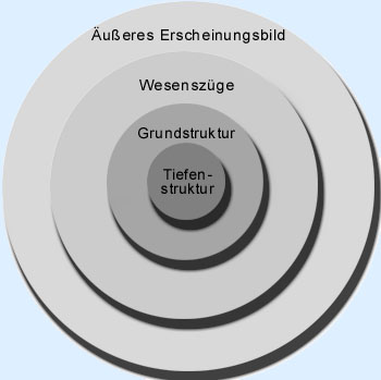 Wir unterscheiden bei der Beschreibung der Persönlichkeitsstruktur zwischen den Wesenszügen, der Grundstruktur und der Tiefenstruktur des Menschen. Die nebenstehende Abbildung versucht modellhaft zu verdeutlichen, was damit gemeint ist.
